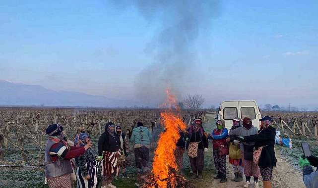 10'ar veya 20'şer kişilik gruplar halinde çalışan kadınlar, işe başlamadan önce bağlardan topladıkları çubukları bir araya getirip yakıyor. Yaktıkları ateşin etrafında toplanarak ısınan işçiler, soğuk havanın etkisini azaltmaya çalışıyor.