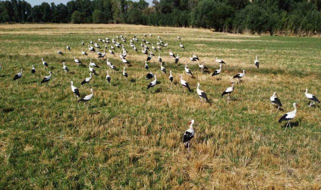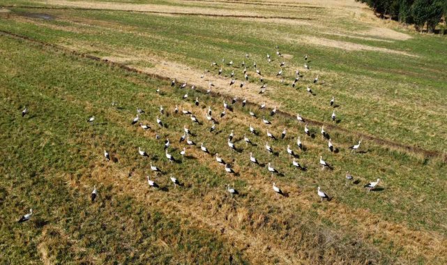 Görüntüler, Yozgat'ın E-88 Karayolu üzerindeki Şefaatli ilçesi yol ayrımında kaydedildi. Sulak araziye gelen onlarca leylek, burada hem beslendi hem de dinlendi. Dron kamerasıyla yapılan çekim sırasında ana leyleklerin bir kısmı uçarak bölgeden uzaklaşırken, bu yılın yavru leylekleri tarlada kaldı.