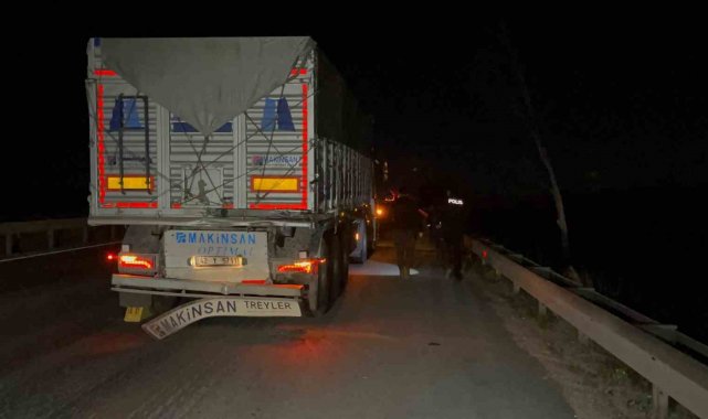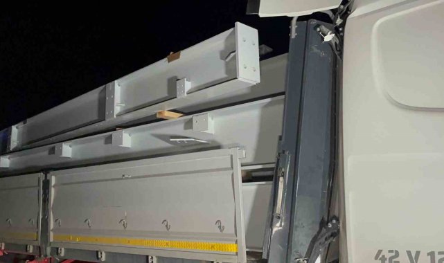 42 V 1248 plakalı tırın dorsesinde bulunan tonlarca ağırlıktaki demir direklerin öne yığıldığı ve kasaya zarar verdiği görüldü.
