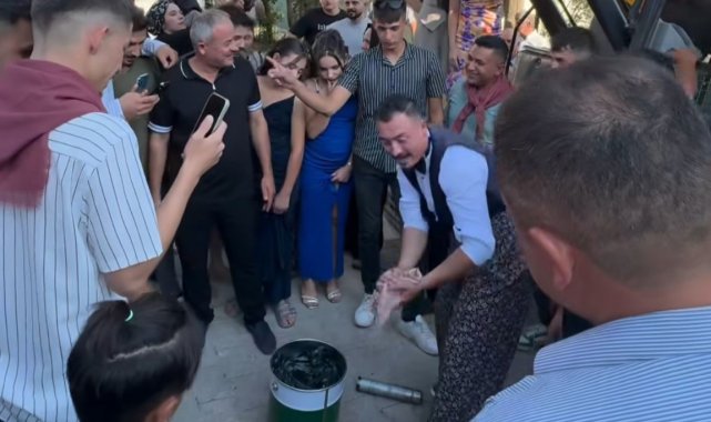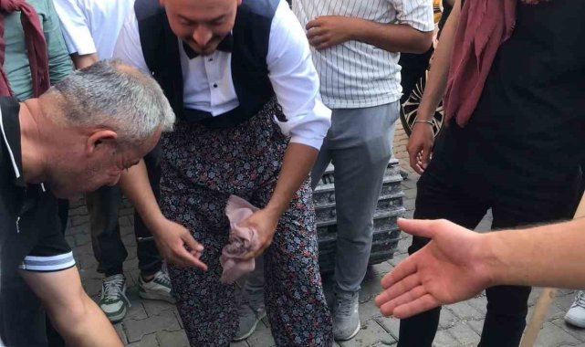 Denizli'nin Güney ilçesinde düzenlenen düğün töreni renkli anlara sahne oldu. Gelin alma töreninin ardından gelini alarak, oğlan evine gelen gençler, damadın evine girmesine fırsat vermeden üzerine basma pantolon giydirdiler. Evin önünde bulunan kepçeyi yağlamasını isteyen gençler damada gres pompası vererek iş makinasının yağlanmasını istediler. Gençlerin isteğini kırmayan damat Mert Fidan, her gün yaptığı işi bu kez en mutlu gününde gerçekleştirdi. Düğün töreninde Mert ve Şermin çifti yakınları ile gönüllerince eğlenirken, ortaya çıkan güzel görüntüler cep telefonlarına kaydedildi.