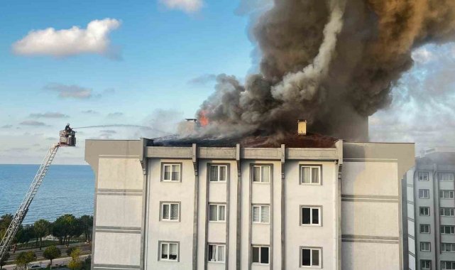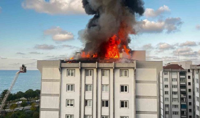 Ordu'da 7 katlı binanın çatısı alev alev yandı