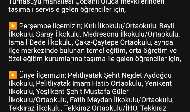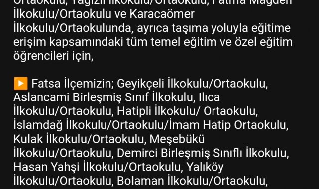 Açıklamada ayrıca, Altınordu, Fatsa, Gülyalı, Perşembe ve Ünye ilçelerindeki bazı okullarda da eğitim ve öğretime bir gün ara verildiğine dikkat çekilerek, "Resmi/özel örgün ve yaygın eğitim kurumlarında (okullar, halk eğitim merkezi kursları, özel öğretim kursları, Kur'an kursları, rehabilitasyon merkezleri, kreşler) 26 Şubat 2025 Çarşamba günü 1 gün süreyle eğitim-öğretime ara verilmiştir. Eğitim-öğretime tamamen ara verilen ilçelerimizin genelinde, kısmen ara verilen yerlerde ise sadece tatil edilen okullarda görev yapan hamile ve engelli kamu görevlilerimiz de aynı gün idari izinli sayılacaktır" denildi.