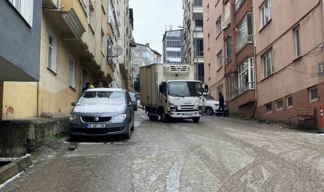 Ordu'nun Ünye ilçesinde kar yağışından dolayı kayganlaşan yolda kayan kamyon, park halindeki 3 araca çarparak durabildi.