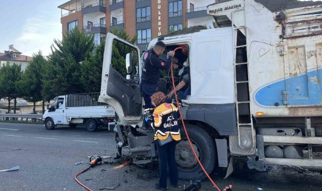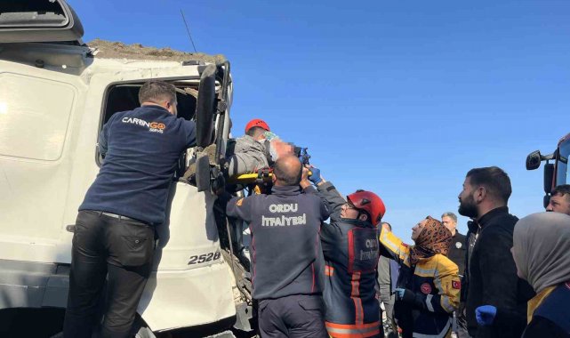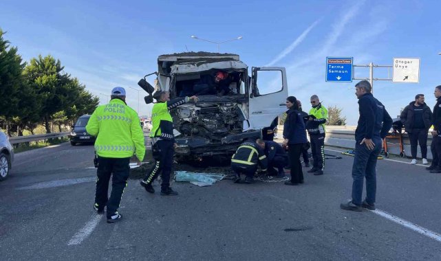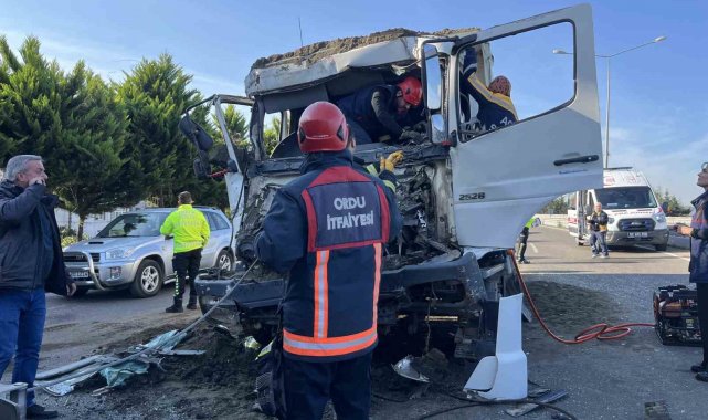 Kaza, Nuriye Mahallesi Samsun-Ordu karayolu çevre bağlantı yolu üzerinde meydana geldi. Edinilen bilgilere göre, Sezgin Ö. (43) idaresindeki 55 AGE 01 çekici plakalı tıra, aynı istikamette seyreden Adem E.'nin (51) kullandığı 52 K 8035 plakalı kum yüklü kamyon çarptı. Çarpışmanın etkisiyle kamyonun sürücüsü Adem E., araç içerisinde sıkıştı. Çevredekilerin 112 Acil Çağrı Merkezi'ne ihbarda bulunması üzerine olay yerine sağlık, polis ve Ordu Büyükşehir Belediyesi Ünye İtfaiye Grup Amirliği'ne bağlı ekipler sevk edildi. İtfaiye ekipleri, yaklaşık 2 saatlik süren çalışmaların ardından sıkışan sürücüyü bulunduğu yerden kurtararak, sağlık ekiplerine teslim etti. Olay yerinde ilk müdahalesi yapılan sürücü, ambulans ile Ünye Devlet Hastanesi'ne kaldırıldı. Kaza nedeniyle Samsun-Ordu karayolu çevre bağlantı yolunda trafik kontrollü olarak tek şeritten sağlandı.