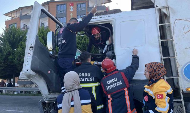 Ordu'nun Ünye ilçesinde tıra çarpan ve araç içerisinde sıkışan kamyon sürücüsü yaralandı. Sürücü, itfaiye ekiplerinin yaklaşık 2 saat süren çalışması sonucu kurtarıldı.