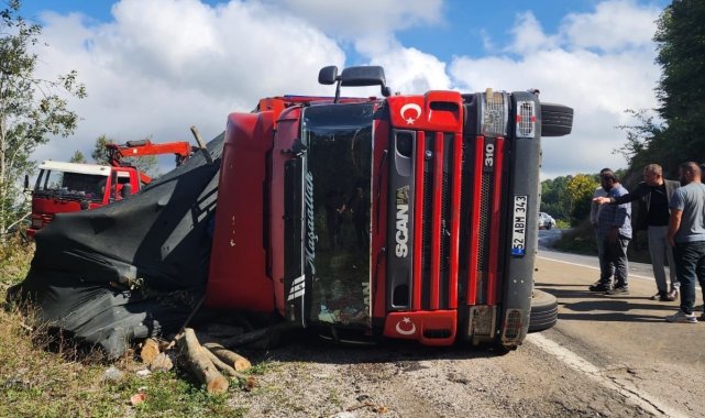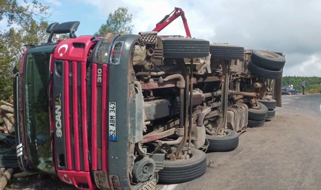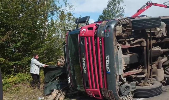 Ordu'da tomruk kamyonu devrildi: 21 ton tomruk yola saçıldı