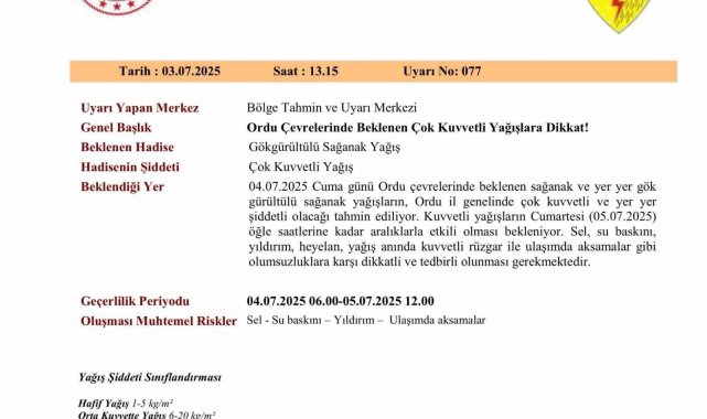 Meteorolojiden yapılan uyarıda, "Ordu çevrelerinde beklenen sağanak ve yer yer gök gürültülü sağanak yağışların, Ordu il genelinde çok kuvvetli ve yer yer şiddetli olacağı tahmin ediliyor. Kuvvetli yağışların cumartesi öğle saatlerine kadar aralıklarla etkili olması bekleniyor. Sel, su baskını, yıldırım, heyelan, yağış anında kuvvetli rüzgar ile ulaşımda aksamalar gibi olumsuzluklara karşı dikkatli ve tedbirli olunması gerekmektedir" denildi.