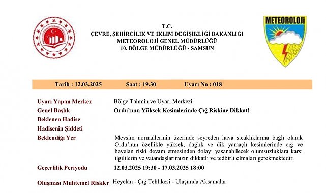 Meteoroloji 10. Bölge Müdürlüğünden yapılan uyarıda, mevsim normallerinin üzerinde seyreden hava sıcaklıklarına bağlı olarak Ordu'nun özellikle yüksek, dağlık ve dik yamaçlı kesimlerinde 12-17 Mart tarihleri arasında çığ ve heyelan riski devam ettiğine dikkat çekildi. Uyarıda, yaşanması muhtemel olumsuzluklara karşı ilgililerin ve vatandaşların dikkatli ve tedbirli olmaları gerektiği belirtildi.