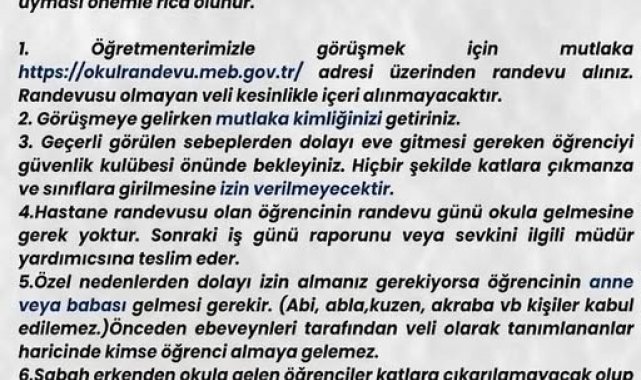 "Öğretmenlerimizle görüşmek için mutlaka https://okul randevu.meb.gov.tr/ adresi üzerinden randevu alınız. Randevusu olmayan veli kesinlikle içeri alınmayacaktır. Görüşmeye gelirken mutlaka kimliğinizi getiriniz. Geçerli görülen sebeplerden dolayı eve gitmesi gereken öğrenciyi güvenlik kulübesi önünde bekleyiniz. Hiçbir şekilde katlara çıkmanıza ve sınıflara girilmesine izin verilmeyecektir. Hastane randevusu olan öğrencinin randevu günü okula gelmesine gerek yoktur. Sonraki iş günü raporunu ve sevkini ilgili müdür yardımcısına teslim eder. Özel nedenlerden dolayı izin almanız gerekiyorsa öğrencinin anne ve babası gelmesi gerekir. (abi, abla, kuzen, akraba gibi kişiler kabul edilemez). Önceden ebeveynleri tarafından veli olarak tanımlananlar haricinde kimse öğrenci almaya gelemez. Sabah erkenden okula gelen öğrenciler katlara çıkarılamayacak olup bahçe veya okul kantininde bekleyecektir. Öğrencinin tanınması için okula okul kıyafeti ile gelmeyen öğrenci okula alınmayacaktır. Hiçbir mazeret kabul edilmeyecektir. Okul bahçe kapısı servis girişleri için sabah ve çıkışta açılacaktır. Onun dışında kapalı kalacaktır. Veli araç girişi okula kesinlikle yasaktır."