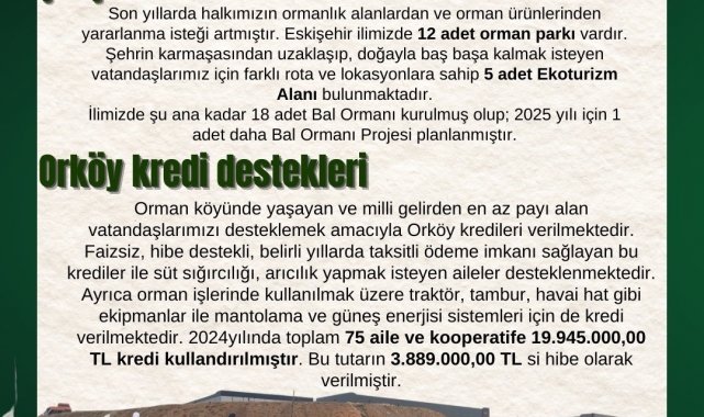 Eskişehir Valiliği, Eskişehir Orman Bölge Müdürlüğü tarafından 2024 yılında gerçekleştirilen faaliyetleri açıkladı. Orman Bölge Müdürlüğü ekiplerince orman yangılarıyla mücadelede, 19 adet yangın gözetleme kulesi, 8 adet dozer, 7 adet greyder, 5 adet ekskavatör, 1 adet helikopter, 20 adet ilk müdahale aracı, 25 adet arazöz ve su ikmal aracı kullanılırken, çalışmalarda 171 personel görev alıyor. Ayrıca, Orman Genel Müdürlüğüne ait insansız hava araçları da gözetleme kulelerine ek destek olarak kullanılıyor. Eskişehir Orman Bölge Müdürlüğü sorumluluğunda bulunan 4 bin 101 kilometre orman içi yol ağına ve bin 26 kilometre yangın emniyet yoluna, 2024 yılında 29 kilometre yol daha eklenerek etki alanı genişletildi. Kentte, 2024 yılında Orman Bölge Müdürlüğü ekiplerince 26 adet orman yangını ile 18 adet kırsal yangına müdahale edildiği belirtildi.