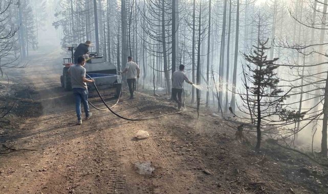 Çankırı'nın Yapraklı ilçesinde çıkan orman yangınına müdahale çalışmalarına köylüler de traktörlerine bağladıkları su tankerleriyle destek veriyor. Alevlerin yerleşim alanlarına ulaşmaması için ekiplerle birlikte yoğun çaba sarf eden köylüler, söndürme faaliyetlerine gönüllü olarak katılıyor.