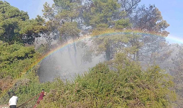 Antalya'nın Manavgat ilçesinde başlayan ve rüzgarın etkisiyle büyüyen yangın, ekiplerin hızlı müdahalesiyle 1 saatte kontrol altına alındı. Söndürme çalışmaları sırasında uçaktan atılan suyun etkisiyle gökkuşağı oluştu.