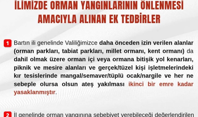 Bartın Valiliği'nden yapılan duyuruda, "İlimizde orman yangınlarının önlenmesi amacıyla alınan ek tedbirlerle, Bartın ili genelinde Valiliğimizce daha önceden izin verilen alanlar (orman parkları, tabiat parkları, millet ormanı, kent ormanı) da dahil olmak üzere orman içi veya ormana bitişik yol kenarları, piknik ve mesire alanları ve gerçek tüzel kişi işletmelerindeki tesislerinde mangal, semaver, tüplü ocak, nargile ve her ne sebeple olursa olsun ateş yakılması ikinci bir emre kadar yasaklanmıştır. İl genelinde orman yangınına sebebiyet verebileceği değerlendirilen havai fişek, dilek balonu, işaret fişeği, meşale gibi yanıcı, parlayıcı, ateşleyici maddelerin satışı ve düğün, asker uğurlaması, festival ve benzeri organizasyonlarda kullanılması ikinci bir emre kadar yasaklanmıştır" denildi.