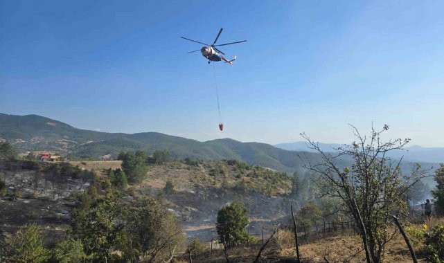 Bursa'nın Orhaneli ilçesinde piknik yapan bir ailenin mangalıdan sıçradığı iddia edilen yangın, kısa sürede büyüdü. Sulama göletinin yanında meydana gelen yangın, helikopterlerin anında müdahalesiyle söndürüldü.