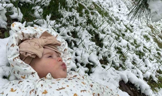 Ailesi ile Ağlan köyüne gezmeye gelen İpek Ada bebek de ilkbahar mevsiminde yağan kardan nasibini alarak kar keyfi yaptı.