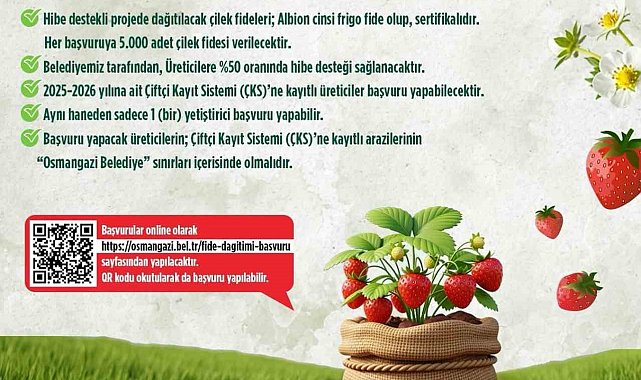 Proje şartlarına göre her bir üreticiye 5 bin adet çilek fidesi teslim edilecek. Fidelerin maliyetinin yüzde 50'si Osmangazi Belediyesi tarafından karşılanacak. Başvuruda bulunacak üreticilerin 2025-2026 yılına ait Çiftçi Kayıt Sistemi (ÇKS) kaydının bulunması ve arazilerinin Osmangazi ilçe sınırları içinde olması gerekiyor. Destekten aynı haneden yalnızca 1 (bir) kişi faydalanabilecek.