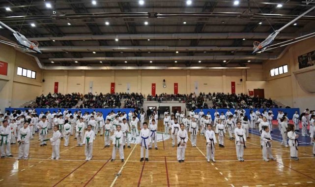 Düzenlenen törende yeni kemerlerine kavuşan karate sporcuları, programın sonunda hocalarından öğrendikleri tekniklerle gösteri maçı yaptı.