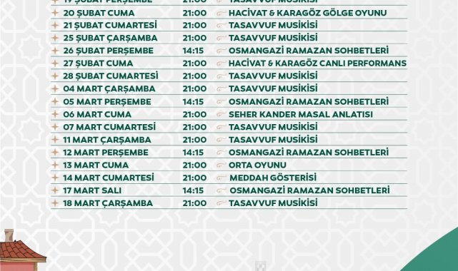 Ramazan ayının ruhuna uygun olarak tasavvuf musikisi akşamı, ney konserleri ve Türk sanat müziği programları vatandaşlara manevi bir yolculuk yaşatacak. Ayrıca Üftade Meydanı'nda gerçekleştirilecek Osmangazi Ramazan Sohbetleri ve masal anlatıları, Ramazan'ın anlam ile değerlerini derinlemesine hissettirecek.