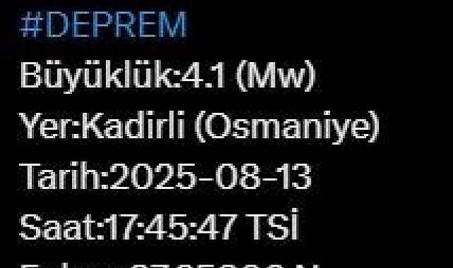 AFAD'dan yapılan açıklamaya göre, saat 17.45'te merkez üssü Osmaniye'nin Kadirli ilçesi olan 4.1 büyüklüğünde bir deprem kaydedildi. Sarsıntı yerin 5 kilometre derinliğinde meydana geldi.