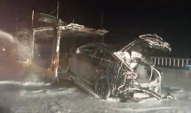 Osmaniye'nin Bahçe ilçesinde araç taşıyan bir tırda çıkan yangında, sıfır 3 araç tamamen yanarak kullanılamaz hale geldi.