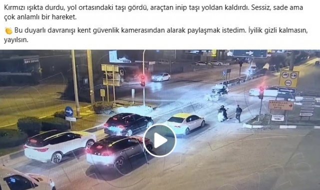 Sosyal medya hesabı üzerinden görüntüyü paylaşan İl Emniyet Müdürü Sarıbuva, "Yolu değil, yüreğimizi açtı. Kırmızı ışıkta durdu, yol ortasındaki taşı gördü, araçtan inip taşı yoldan kaldırdı. Sessiz, sade ama çok anlamlı bir hareket. Bu duyarlı davranışı kent güvenlik kamerasından alarak paylaşmak istedim. İyilik gizli kalmasın, yayılsın" notuyla görüntüyü paylaştı.