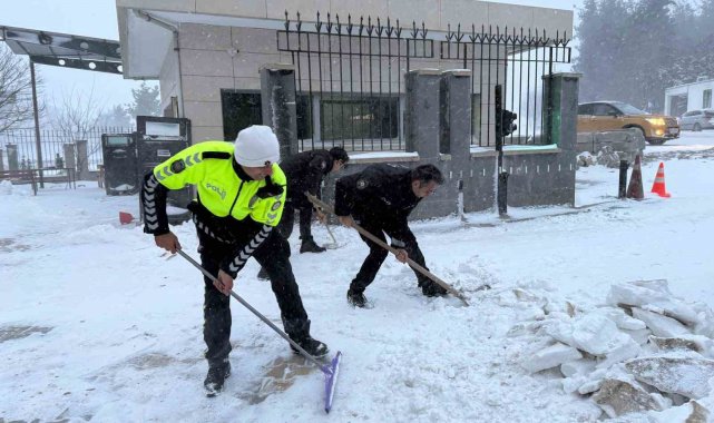 Osmaniye'nin Hasanbeyli ilçesinde etkili olan kar yağışının ardından emniyet mensupları, hizmet binalarının önünde ve çevresinde biriken kar kütlelerini kendi imkânlarıyla temizledi.