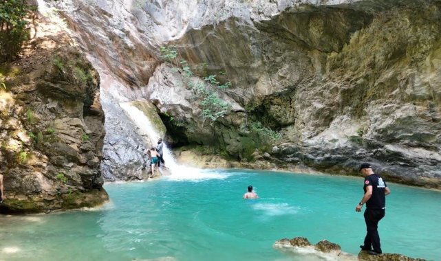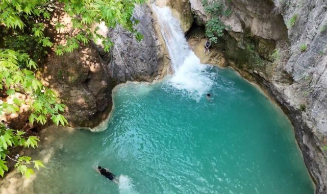 Osmaniye'de etkisini artıran sıcak hava nedeniyle bunalan vatandaşlar, Sarısu Şelalesi'nde serinledi.