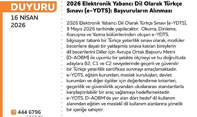 ÖSYM, Türkiye'de bir ilk olarak Elektronik Yabancı Dil Olarak Türkçe Sınavı'nın (e-YDTS) 9 Mayıs'ta yapılacağını açıkladı. Okuma, dinleme, konuşma ve yazma bölümlerinden oluşan e-YDTS'nin bilgisayar tabanlı bir Türkçe yeterlilik sınavı olarak, modüler becerilere dayalı bir yaklaşımla sınava katılan adayların dil becerilerini Diller İçin Avrupa Ortak Başvuru Metni (D-AOBM) ile uyumlu bir şekilde ölçeceği belirtildi.