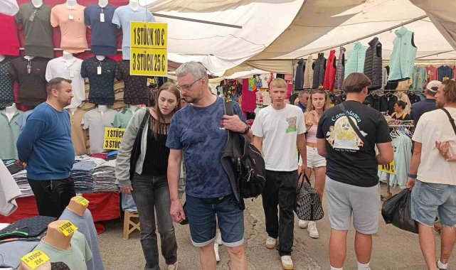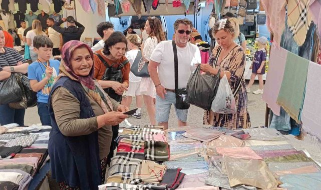 Minibüslerden inerek Antalya Caddesi üzerindeki pazara ulaşan turistler, giyim, çanta, valiz ve hediyelik eşya alışverişi yaptı. Ellerinde poşetlerle pazar alanından ayrılan turistler, pazarcı esnafının da yüzünü güldürdü.
