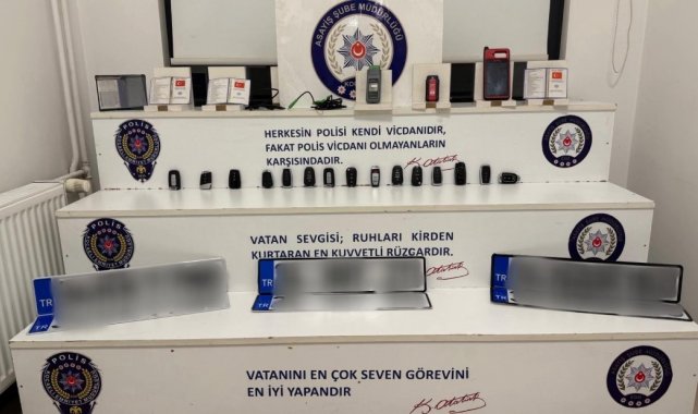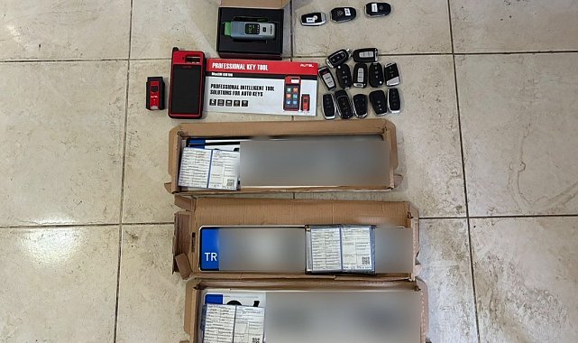 Şüphelilerin iş yerinde yapılan aramada ise şasi ve beyin bilgilerini okumaya yarayan OBD cihazı, araç anahtarlarını kopyalamak için kullanılan immobilizer cihazı, 3 çift sahte plaka, 3 çalıntı araca ait ruhsat, farklı araçlara ait 3 kopyalanmış anahtar ve kopyalanmaya hazır 11 adet ham anahtar ele geçirildi.