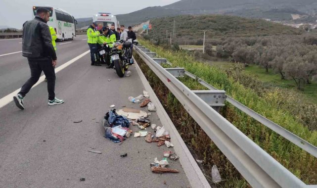 Gebze-Orhangazi-İzmir Otoyolu Orhangazi yakınlarında meydana gelen trafik kazasında motosiklet yol kenarındaki çöplere takılarak savruldu. Metrelerce sürüklenen motosikletin sürücüsü yaralandı.
