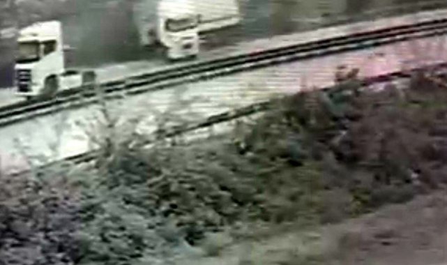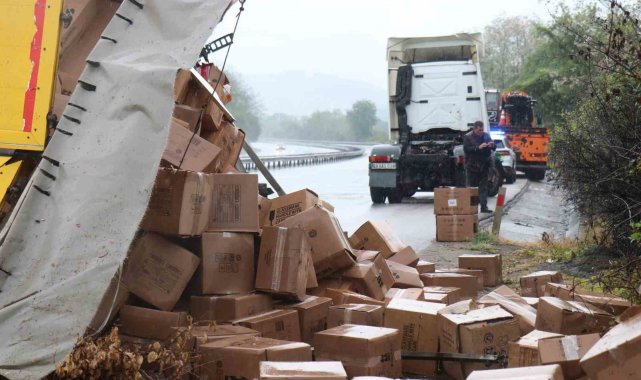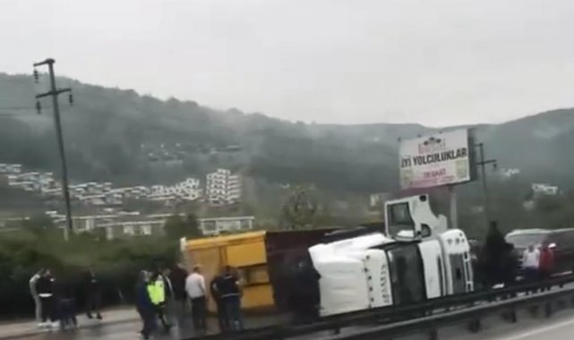Otoyolun Sapanca geçişi Yeni Mahalle mevkii Ankara istikametinde saat 08.30 sıralarında meydana gelen kazada, A.Ç. idaresindeki 49 AAS 038 plakalı tır, bariyerlere çarparak yan yattı. Meydana gelen kaza sebebiyle otoyolun Ankara istikametinde trafik durdu, sürücüler kontak kapattı. Durumun haber verilmesi üzerine bölgeye sağlık ve jandarma ekipleri sevk edildi. Olay yerine gelen ekipler, tırı bulunduğu yerden kaldırmak için çalışmalarına yaklaşık 3 saattir devam ederken kaza anı güvenlik kamerasına yansıdı. Görüntülerde, tırın kontrolden çıkarak bariyerlere çarpması ve otoyolda yan yatması ve bir aracın son anda durması yer alıyor.