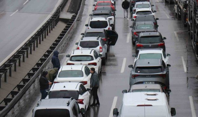 Anadolu Otoyolu Sakarya geçişinde kontrolden çıkan tır, bariyerlere çarparak devrildi. Meydana gelen kaza sonrasında kilometrelerce oluşan araç kuyruğunda sürücüler kontak kapattı. Tırın bölgeden kaldırılma çalışmaları devam ederken kaza anı güvenlik kamerasına yansıdı.