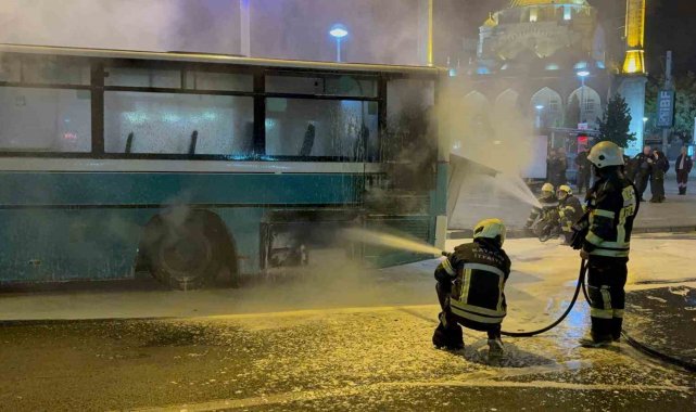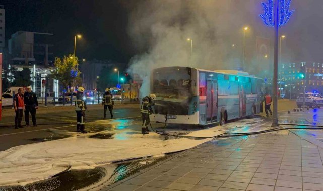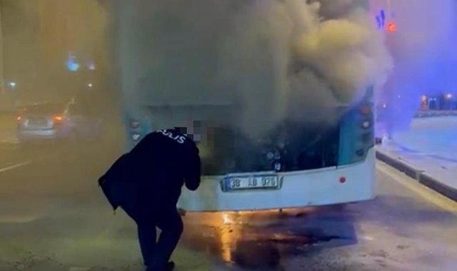 Kayseri'nin Melikgazi ilçesinde özel halk otobüsü kırmızı ışıkta beklediği sırada motor kısmından alev alırken, polis ekiplerinin müdahalesi yangının büyümesini engelledi.