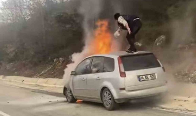 Osmangazi ilçesinde seyir halindeki araç, motor kısmından alev aldı. Durumu fark eden sürücü aracını emniyet şeridine çekti. Çevredekiler yangın tüpü ararken, sürücü canını hiçe sayıp aracın tavanına çıkarak bir şişe suyu alevlerin üzerine döktü. O anlar kameraya yansırken, itfaiye ekiplerinin söndürdüğü araç kullanılamaz hale geldi. Olayla ilgili tahkikat başlatıldı.