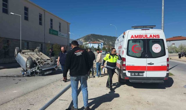 Kütahya'da aydınlatma direğine çarpan otomobil ters döndü, kazada sürücü yaralandı.