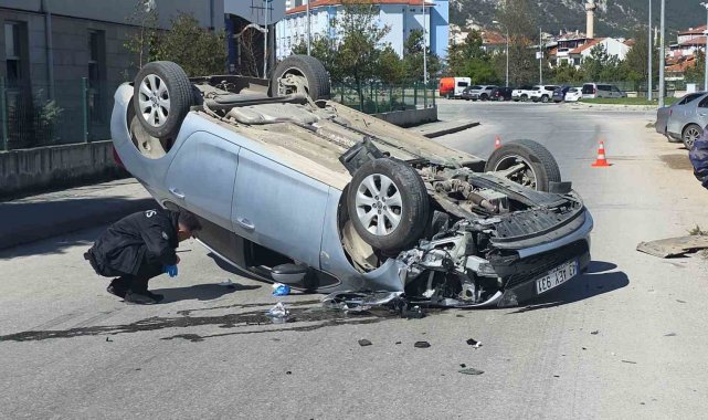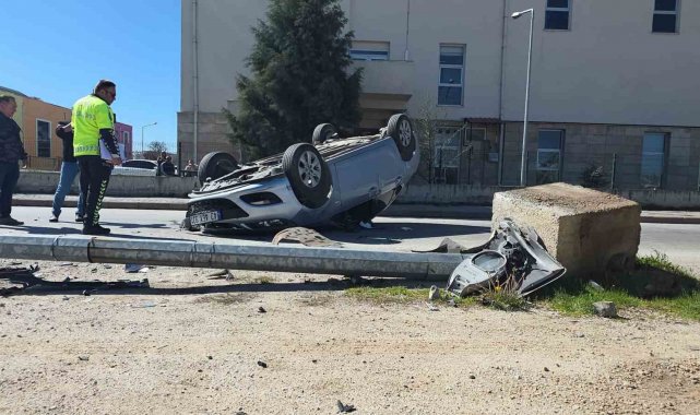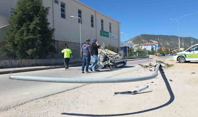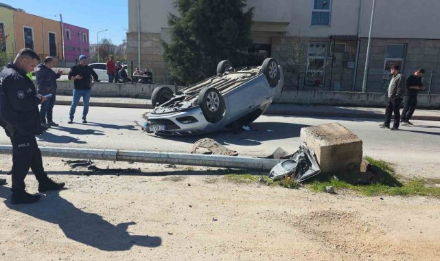 Otomobil aydınlatma direğine çarpıp ters döndü, sürücü yaralandı