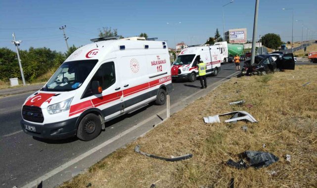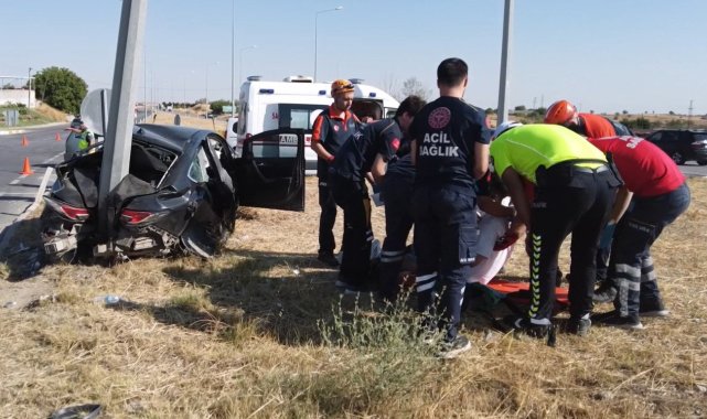 Edirne'de otomobilin direğe ok gibi saplandığı kazada 3 kişi yaralandı.