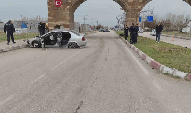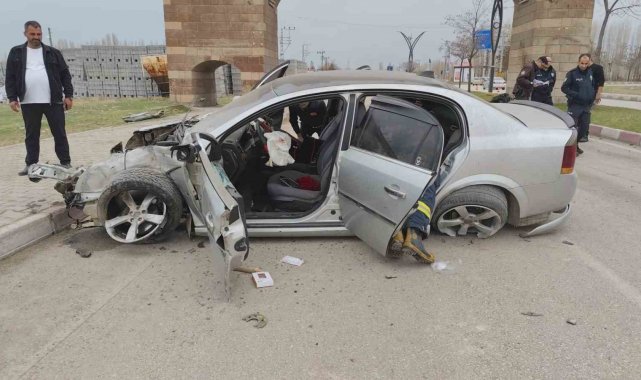 Van'ın Erciş ilçesi girişindeki kemerin ayağına çarpan otomobildeki 3 kişi yaralandı.