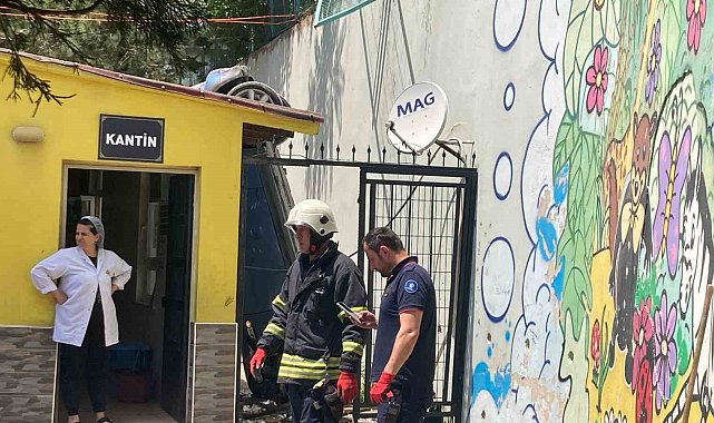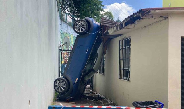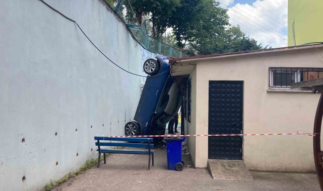 Kocaeli'de kontrolden çıkan otomobil, 5 metrelik istinat duvarını aşarak okul bahçesine uçtu. Otomobil, kantin ve istinat duvarı arasında dik kalırken, sürücü yaralandı. Öğrencilerin derste olması faciayı önledi.