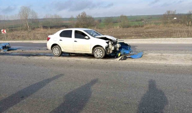 Kırklareli'nin Pınarhisar ilçesinde sabah saatlerinde meydana gelen trafik kazasında bir otomobil, duble yol girişi refüj başı yön tabelasına çarptı.