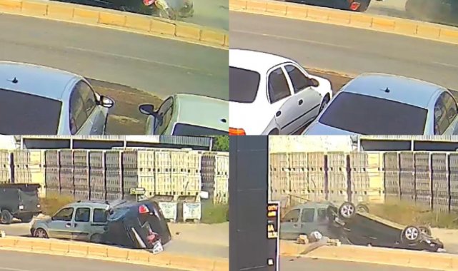 Mersin'de manevra yapan kamyon nedeniyle yolda taşıtlar durdu, bu sırada hızla gelen bir otomobil refüje çarpıp 2 hafif ticari araca vurarak ters döndü. Sürücüsünün yaralı kurtulduğu kaza anları ise bir iş yerinin güvenlik kamerasına saniye saniye yansıdı.