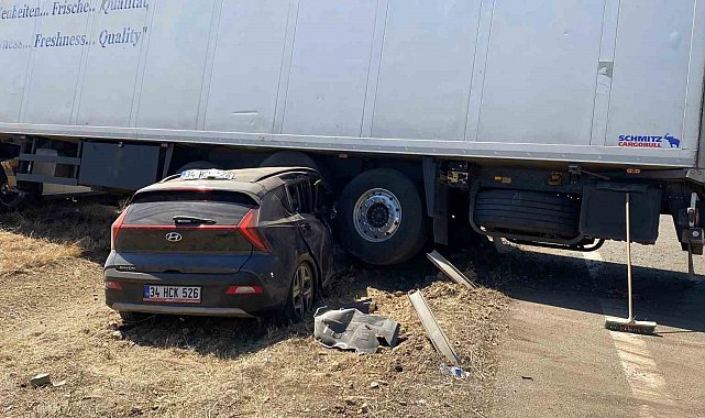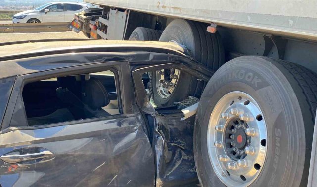 Bolu Anadolu Otoyolu'nda lastiği patlayan tır kontrolden çıkarak otomobille çarpıştı. Çarpışmanın etkisiyle otomobil yaklaşık 20 metre boyunca tırın altında sürüklendi.