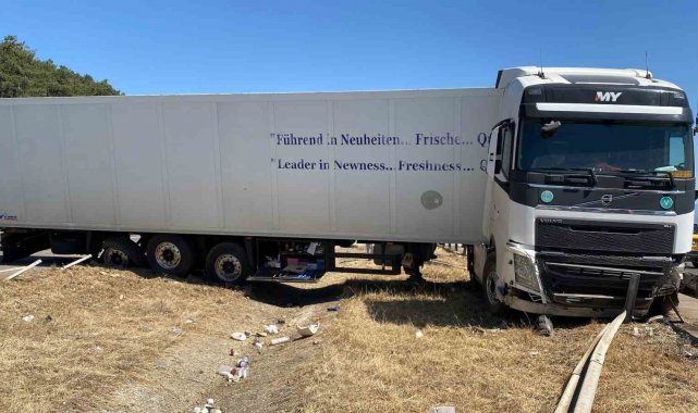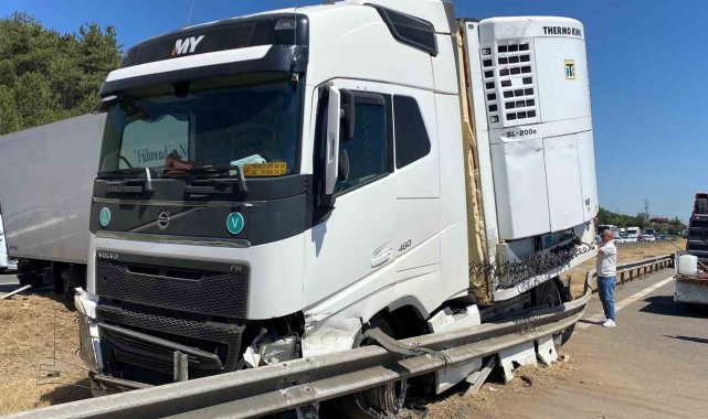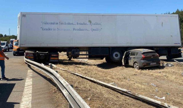 Bolu Anadolu Otoyolu'nda lastiği patlayan tır kontrolden çıkarak otomobille çarpıştı. Çarpışmanın etkisiyle otomobil yaklaşık 20 metre boyunca tırın altında sürüklendi. Her iki araç da orta refüje çıkarak durabildi. Meydana gelen kazada 1 kişi yaralandı. Kaza, Anadolu Otoyolu Çakmaklar mevkiinde meydana geldi. Edinilen bilgilere göre, İstanbul istikametinde seyreden Mehmet Yıldız idaresindeki 34 CKH 310 plakalı tır, sağ şeritte giderken ön lastiği patladı. Lastiğin patlamasıyla kontrolden çıkan tır ile, aynı istikamette sol şeritte seyreden Anıl Ayhan. E. (35) yönetimindeki 34 HCK 526 plakalı otomobil çarpıştı. Çarpışmanın etkisiyle otomobil tırın altına girdi ve yaklaşık 20 metre boyunca sürüklendi. Her iki araç da orta refüjdeki bariyerleri aşarak durabildi. Kazada otomobil içerisinde yolcu konumunda bulunan Selim E. (60) yaralandı. Çevredeki sürücülerin ihbarı üzerine olay sağlık, jandarma ve kara yolları ekipleri sevk edildi. Yaralanan Selim E., sağlık ekipleri tarafından olay yerinde ilk müdahalesi yapıldıktan sonra, Abant İzzet Baysal Eğitim ve Araştırma Hastanesi'ne kaldırıldı. Kaza nedeniyle yol her iki istikametten kontrollü olarak sağlanırken, araçların çekici ve vinç yardımıyla kaldırılmasının ardından trafik akışı normale döndü. Sağ şeritte ilerlerken tekerinin patladığını söyleyen tır sürücü Mehmet Yıldız, "Ön lastik patladı, tır sola çekti. Gelen otomobilde lastiklerin arasına girdi" dedi. Kazayla ilgili inceleme başlatıldı.