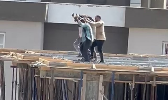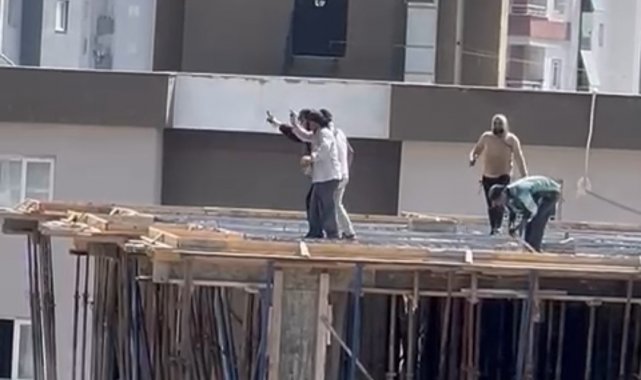 Adana'da bir inşaatın 10'uncu katında çalışan işçiler otomobilden gelen müzik sesiyle birlikte oldukları yerde halay çekmeye başladı.