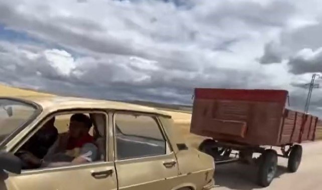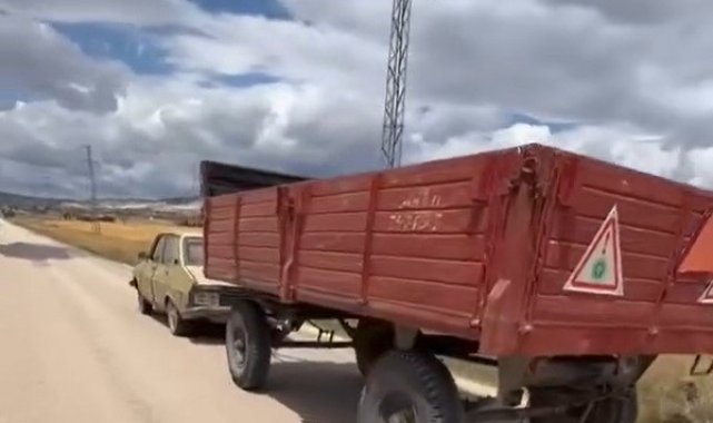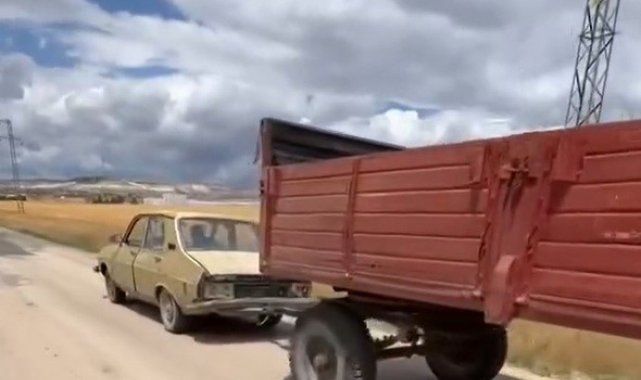 Otomobile gelişigüzel bağlanan traktör römorku trafiği tehlikeye düşürdü