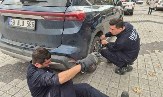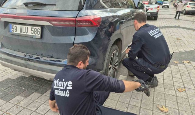 Tekirdağ'da park halindeki otomobilin arka lastik kısmına giren kedi, itfaiye ekiplerinin hava tüpüyle yaptığı dikkatli çalışma sonucu zarar görmeden kurtarıldı.