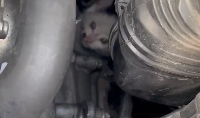 Otomobilin motoruna sıkışan yavru kedi kurtarıldı