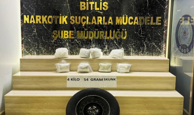 Bitlis'te narkotik polisi tarafından bir otomobilde yapılan aramada yedek lastik içerisinde 4 kilo 54 gram Skunk uyuşturucu maddesi ele geçirildi.