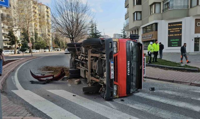 Kayseri'nin Melikgazi ilçesinde otomobille çarpışan canlı hayvan nakil kamyoneti yan yatarken, aracın kasasında bulunan hayvan dışkıları yola savruldu.